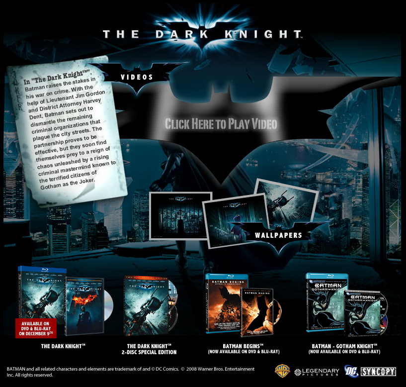 Microsite reflecting the dark imagery used in the famous Batman movies. The site itself takes on a dark look to help the viewer get in the mood with the offered wallpapers and video movie preview included.