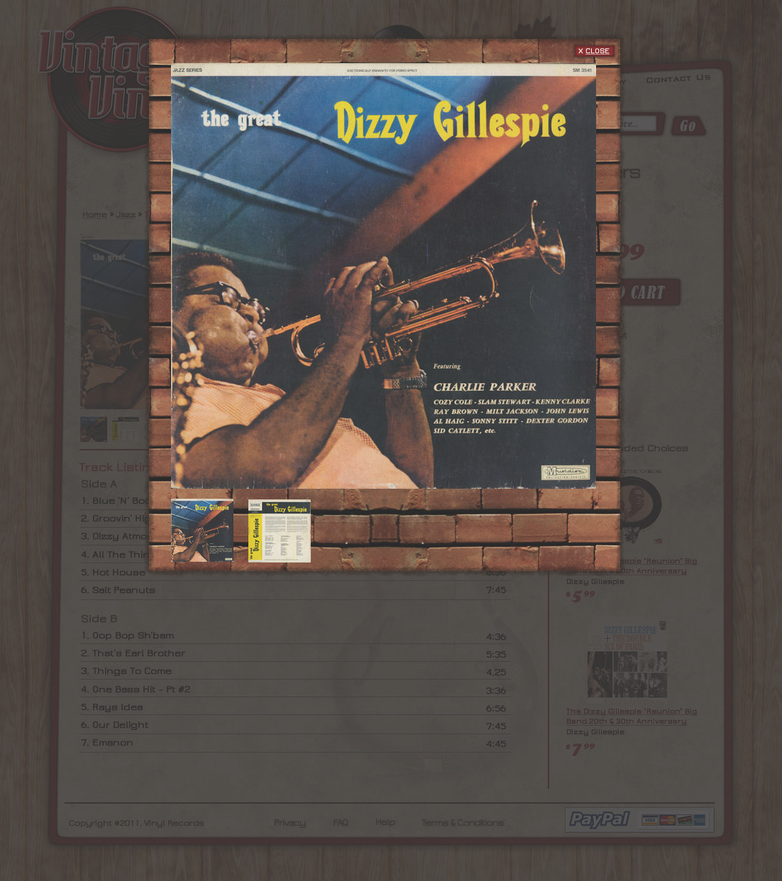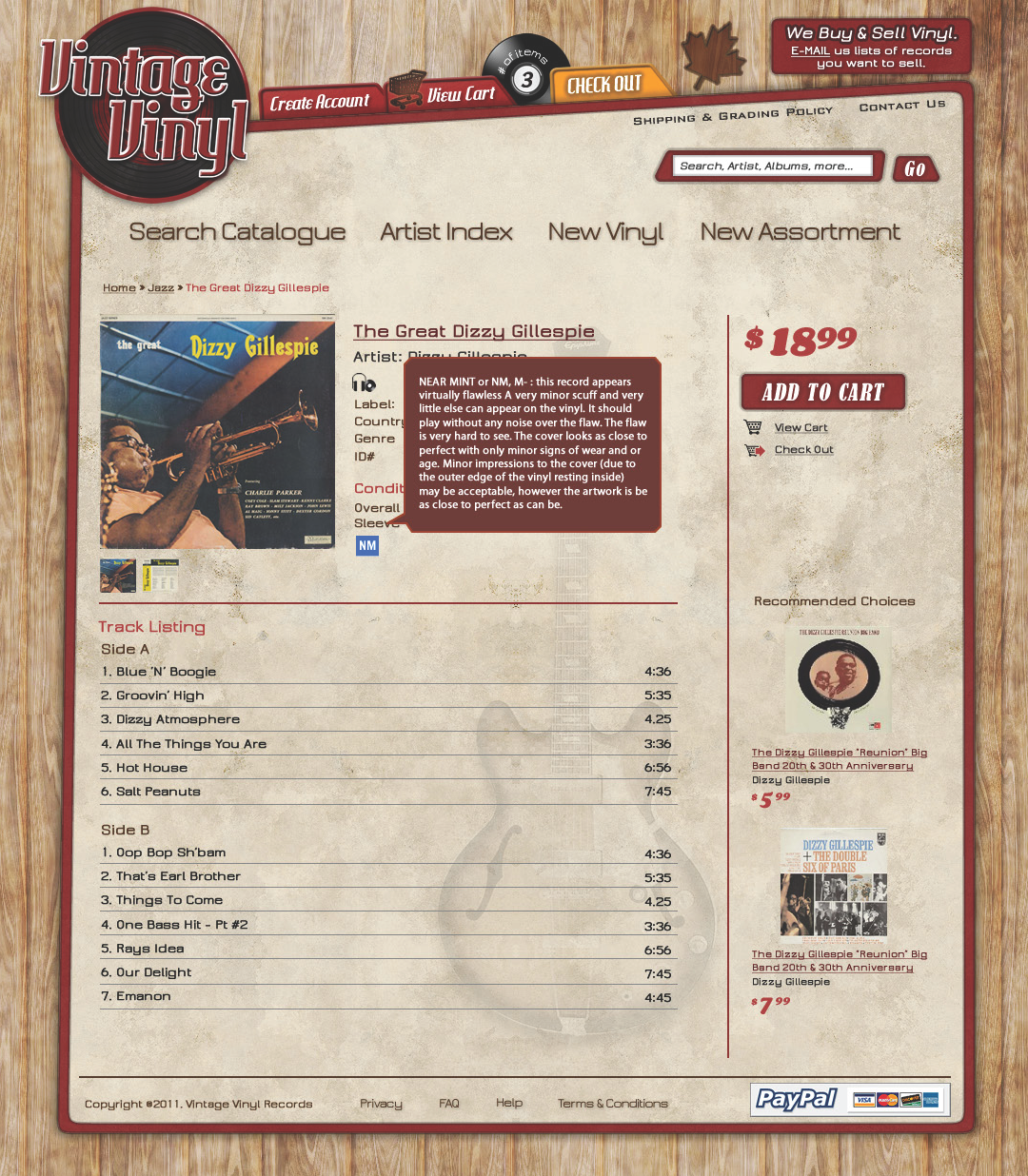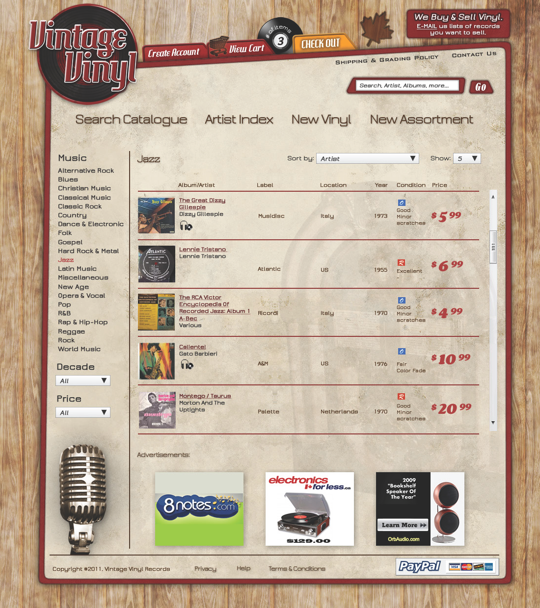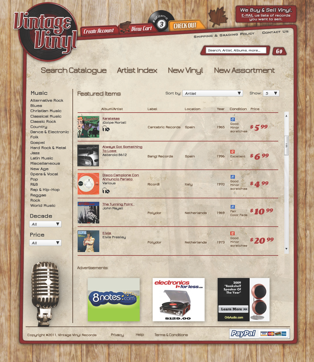 An online site which sells used record albums to the general public. Shoppers are able to browse by genre, artist, year, or song title to find what they are searching for. The system was integrated with a PayPal service.
